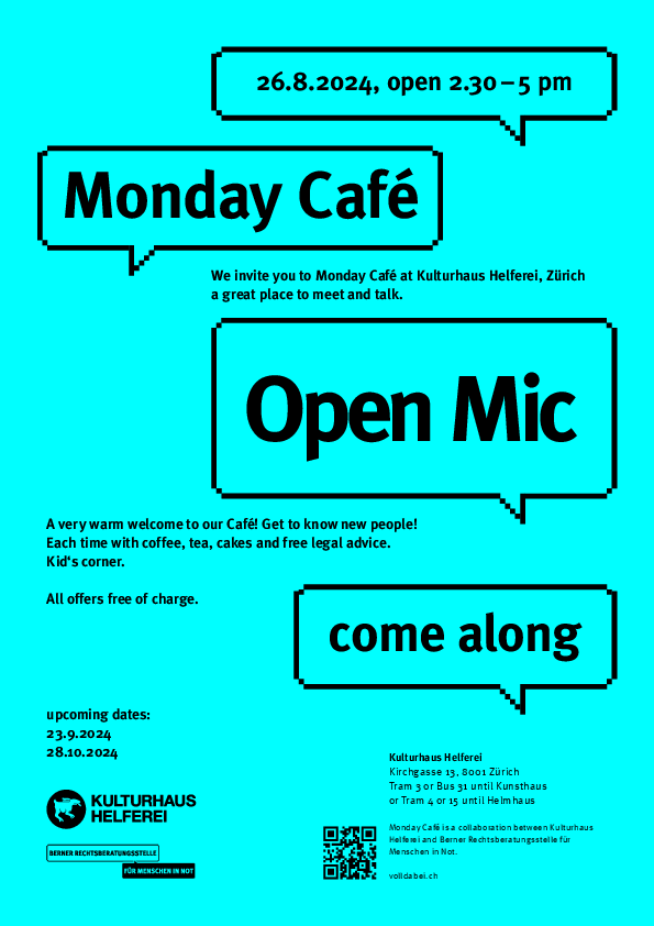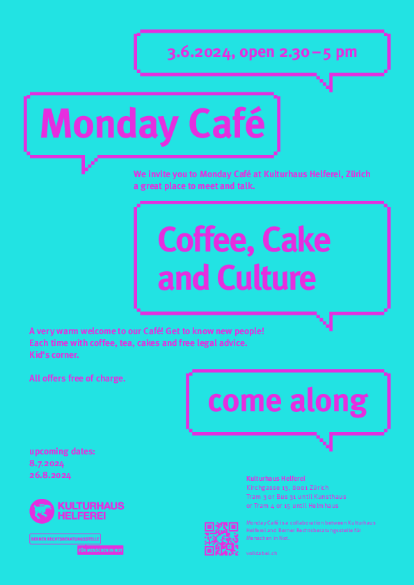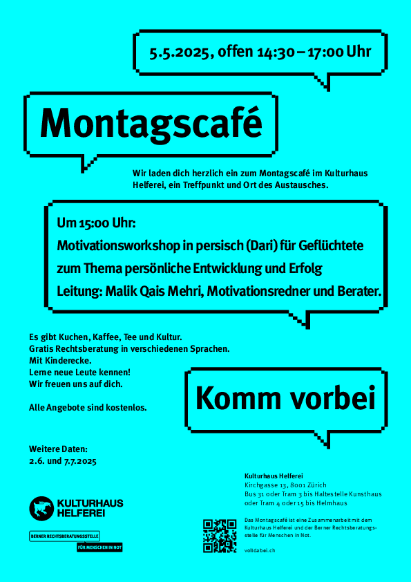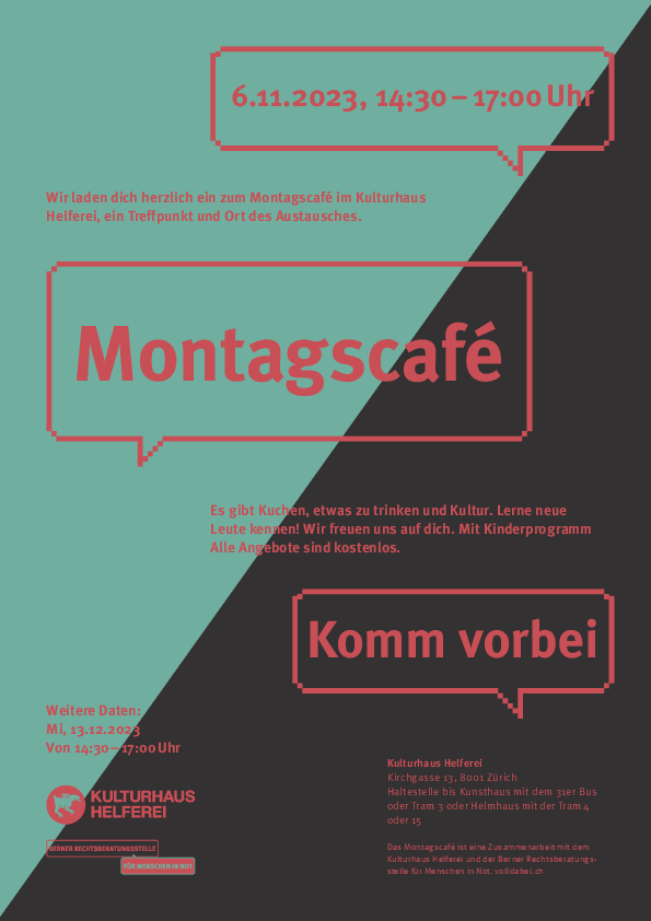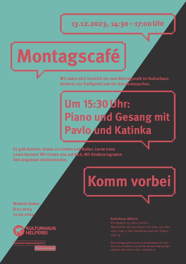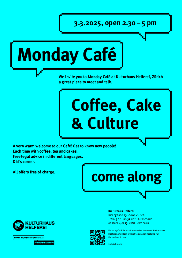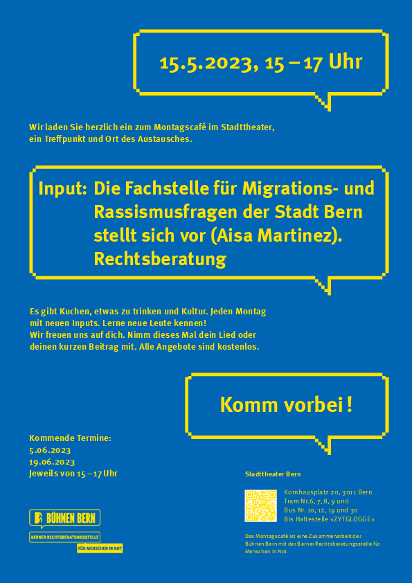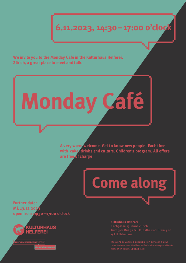 Das Montagscafé ist ein kostenloses Angebot und bietet Raum für grenzenlosen Austausch, Informationen und Kultur bei Kaffee und Kuchen. Gedruckte Flyer mit allen Daten fürs erste 1. Halbjahr 2023 (Deutsch / Englisch) können untermontagscafe[at]rbsbern.ch bestellt werden. Wir freuen uns, wenn möglichst viele Menschen vom Montagscafé erfahren und daran teilnehmen können!
