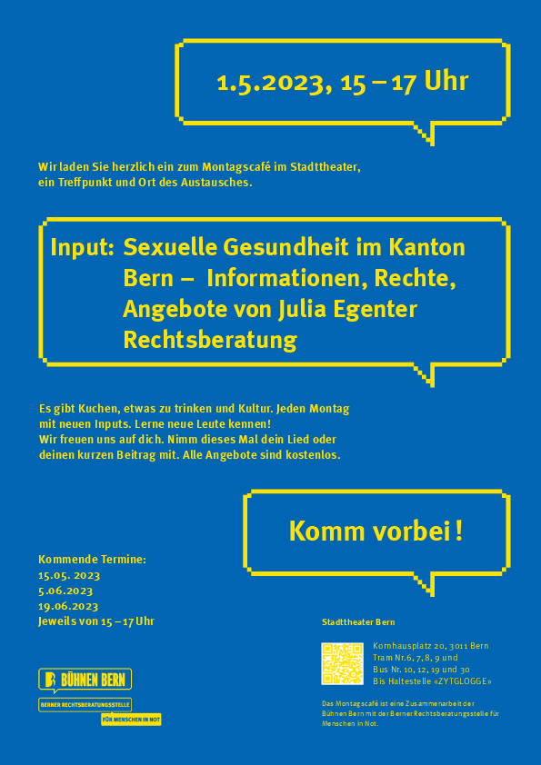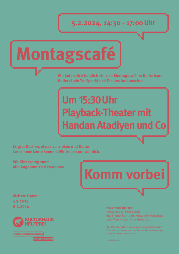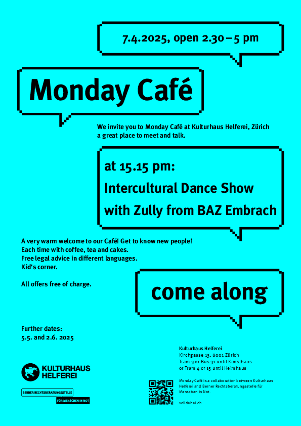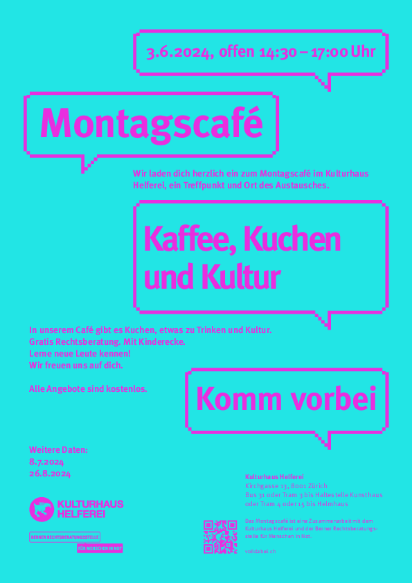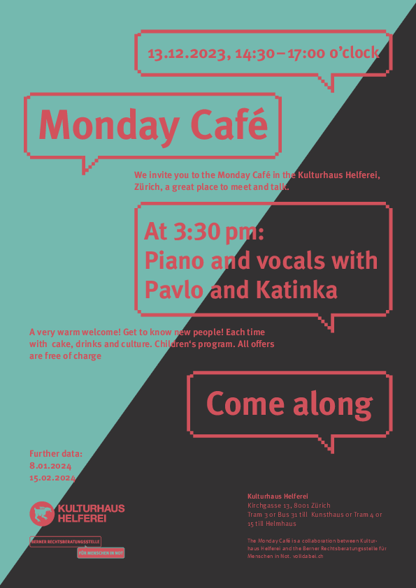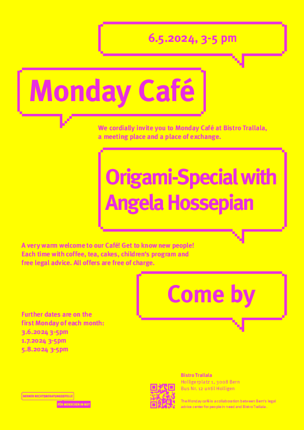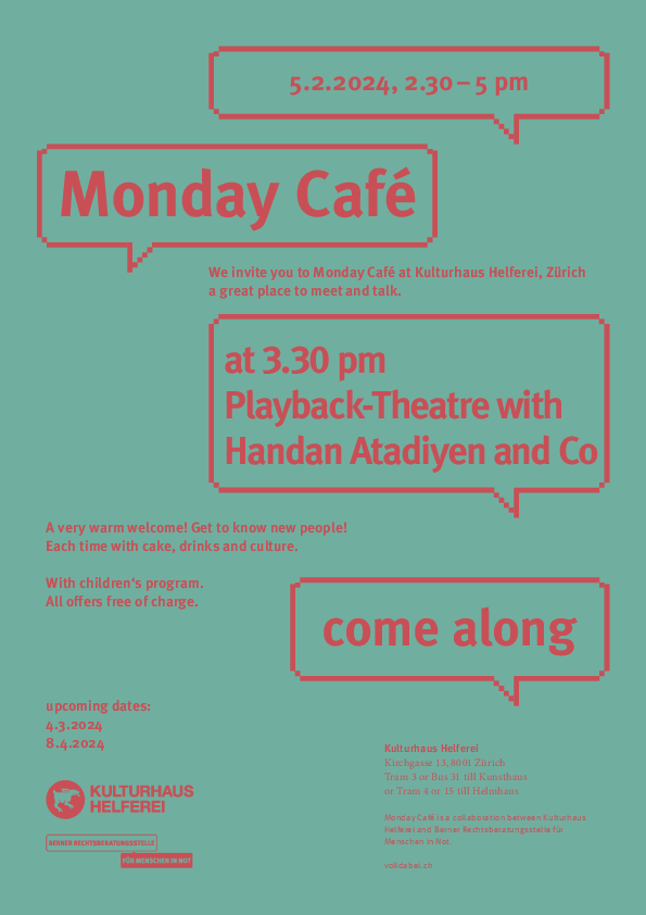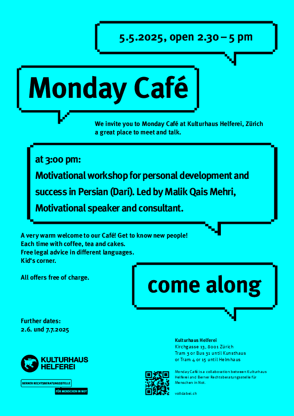 Das Montagscafé ist ein kostenloses Angebot und bietet Raum für grenzenlosen Austausch, Informationen und Kultur bei Kaffee und Kuchen. Gedruckte Flyer mit allen Daten fürs erste 1. Halbjahr 2023 (Deutsch / Englisch) können untermontagscafe[at]rbsbern.ch bestellt werden. Wir freuen uns, wenn möglichst viele Menschen vom Montagscafé erfahren und daran teilnehmen können!