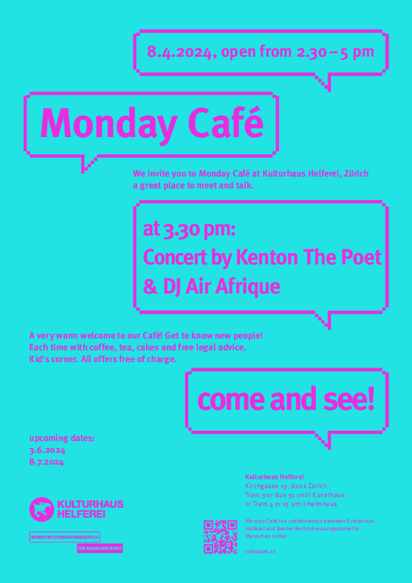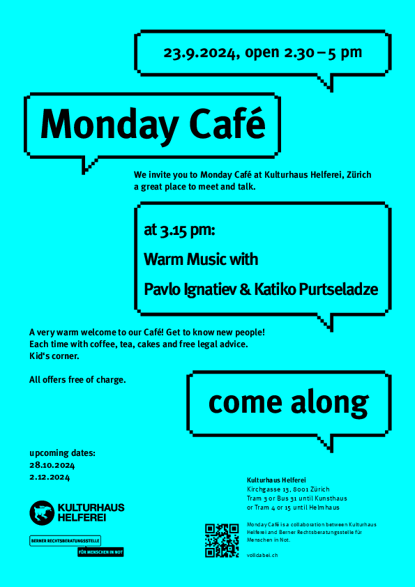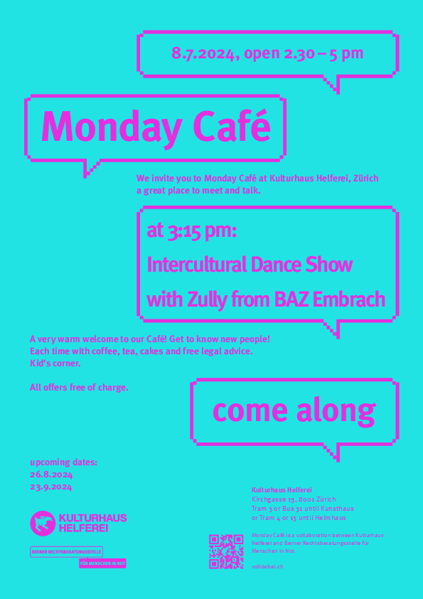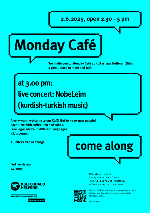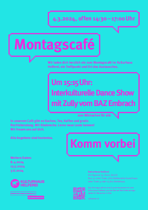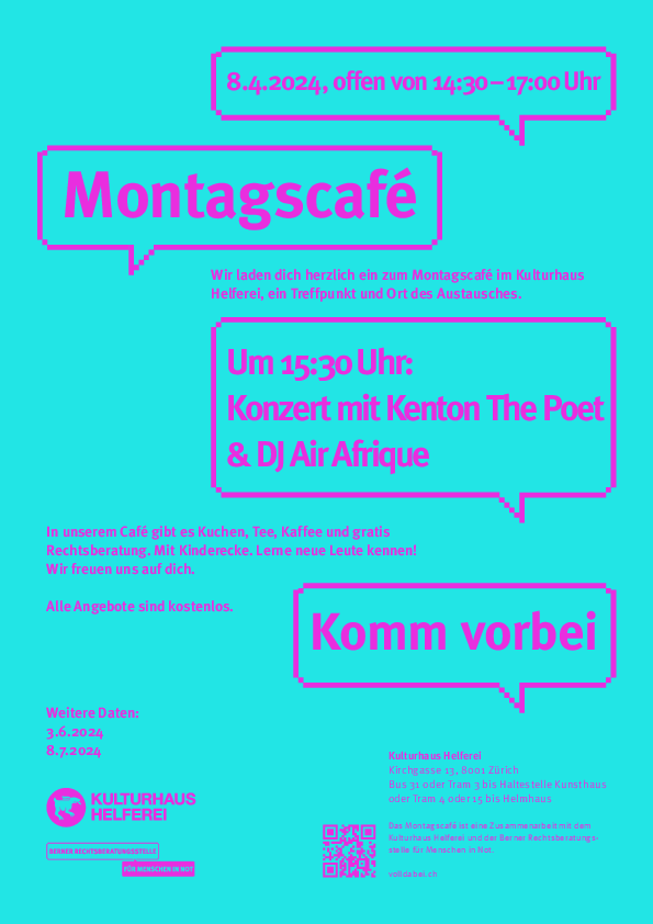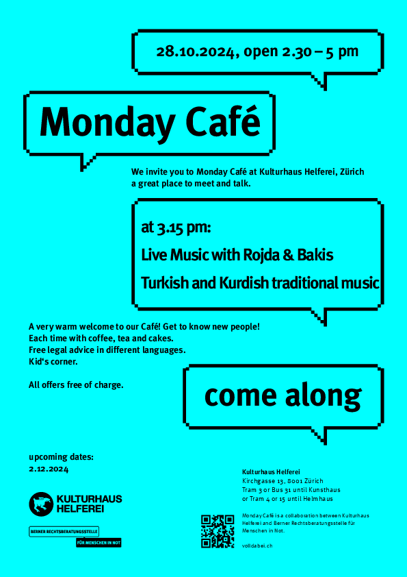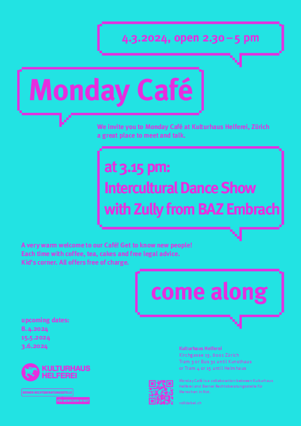 Das Montagscafé ist ein kostenloses Angebot und bietet Raum für grenzenlosen Austausch, Informationen und Kultur bei Kaffee und Kuchen. Gedruckte Flyer mit allen Daten fürs erste 1. Halbjahr 2023 (Deutsch / Englisch) können untermontagscafe[at]rbsbern.ch bestellt werden. Wir freuen uns, wenn möglichst viele Menschen vom Montagscafé erfahren und daran teilnehmen können!