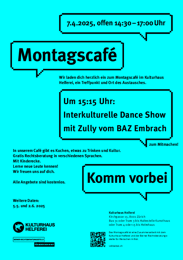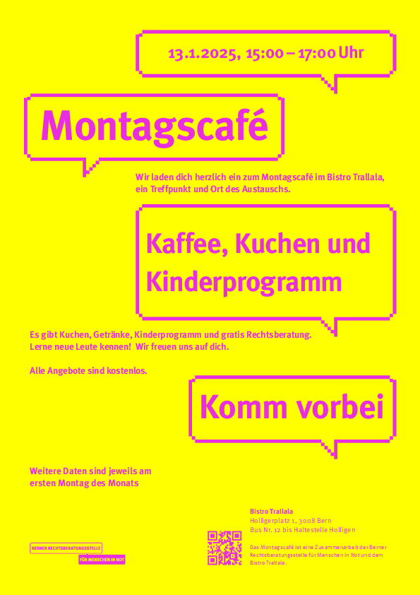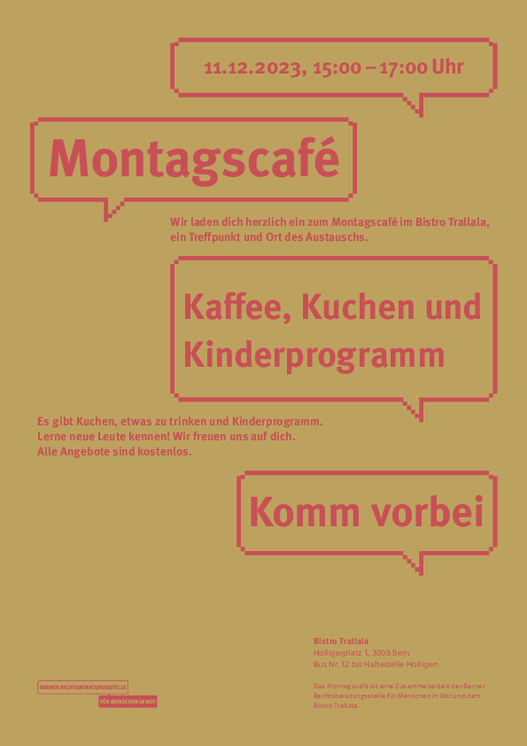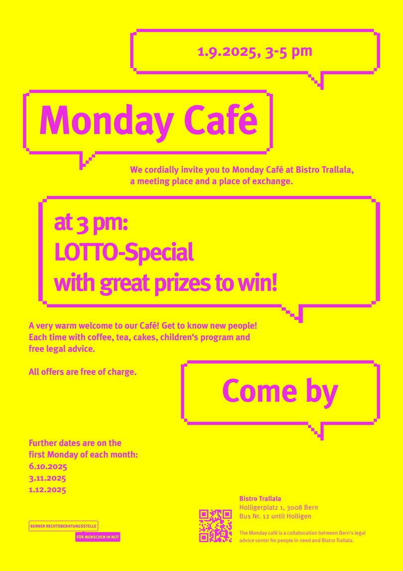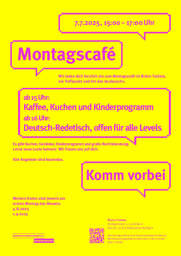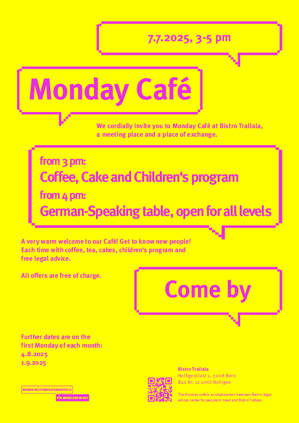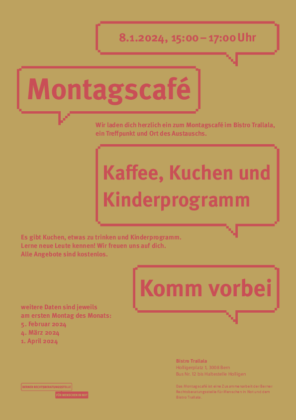 Das Montagscafé ist ein kostenloses Angebot und bietet Raum für grenzenlosen Austausch, Informationen und Kultur bei Kaffee und Kuchen. Gedruckte Flyer können untermontagscafe[at]rbsbern.ch bestellt werden. Gerne dürfen Sie diese Einladung weiterleiten – wir freuen uns, wenn möglichst viele Menschen vom Montagscafé erfahren.