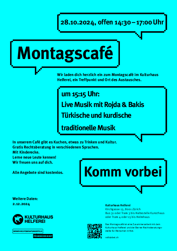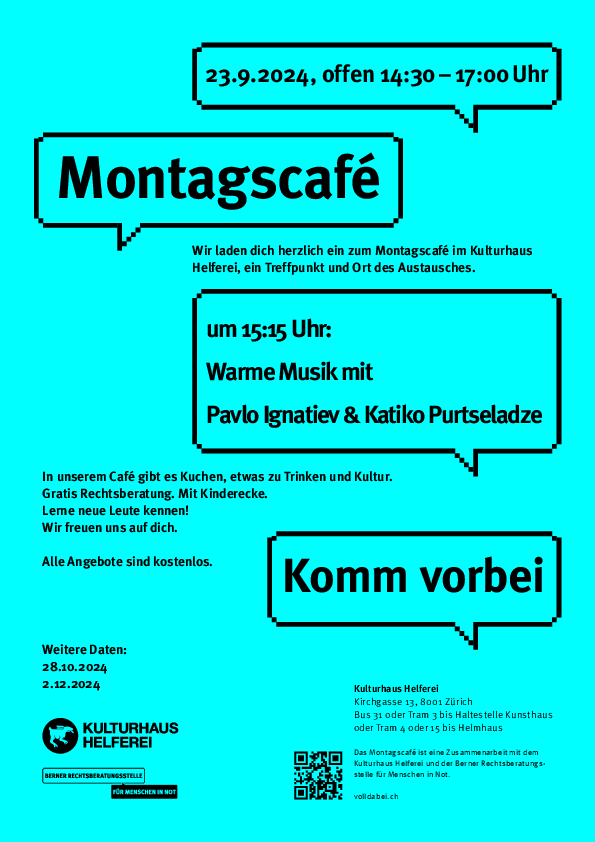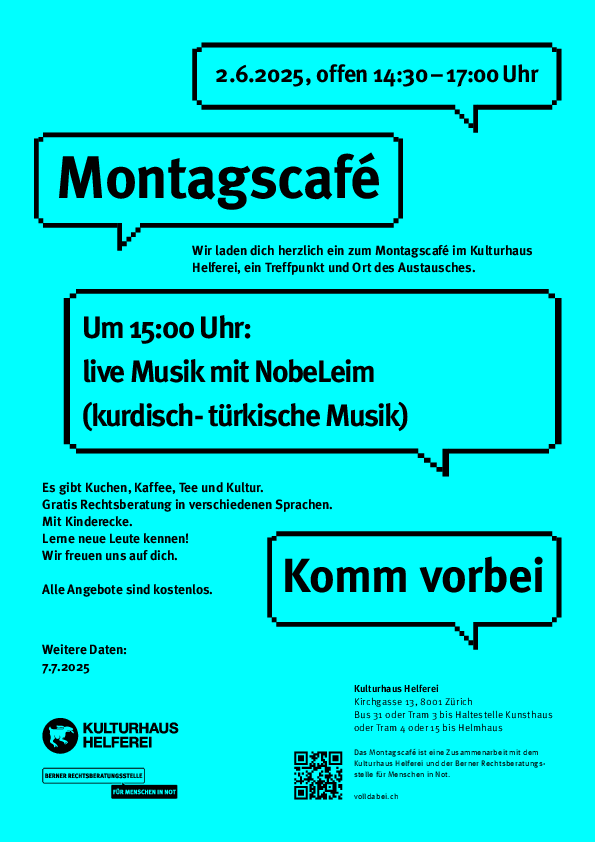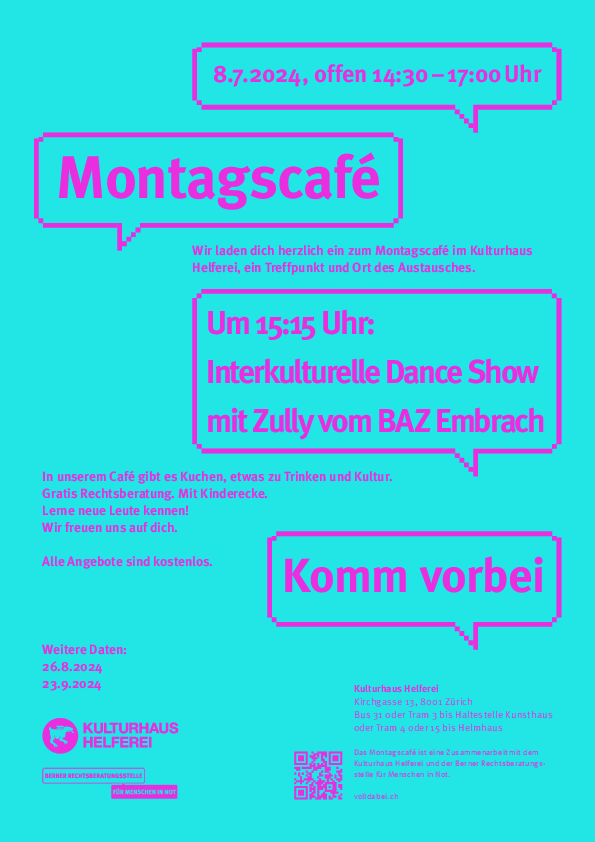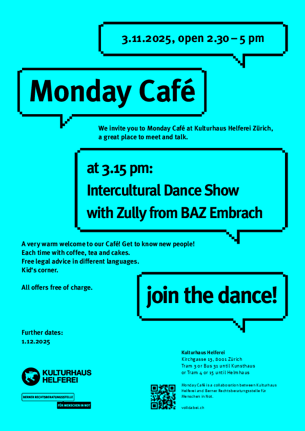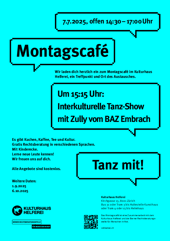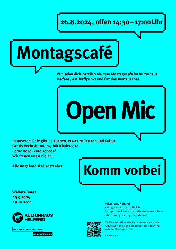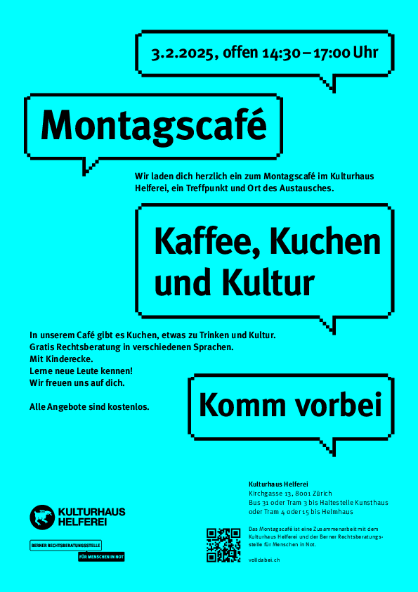Das Montagscafé ist ein kostenloses Angebot und bietet Raum für grenzenlosen Austausch, Informationen und Kultur bei Kaffee und Kuchen. Gedruckte Flyer können untermontagscafe[at]rbsbern.ch bestellt werden. Gerne dürfen Sie diese Einladung weiterleiten – wir freuen uns, wenn möglichst viele Menschen vom Montagscafé erfahren.