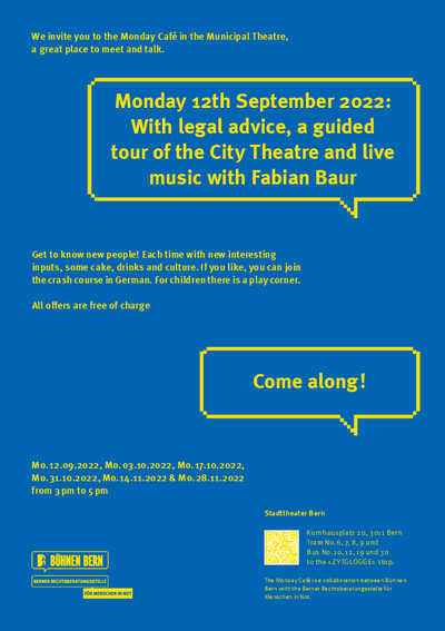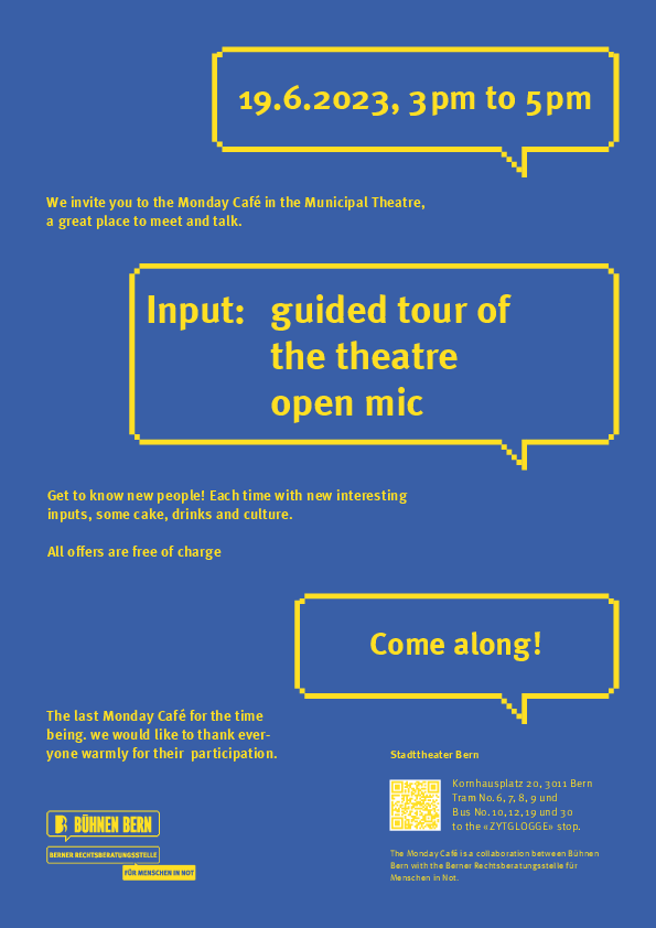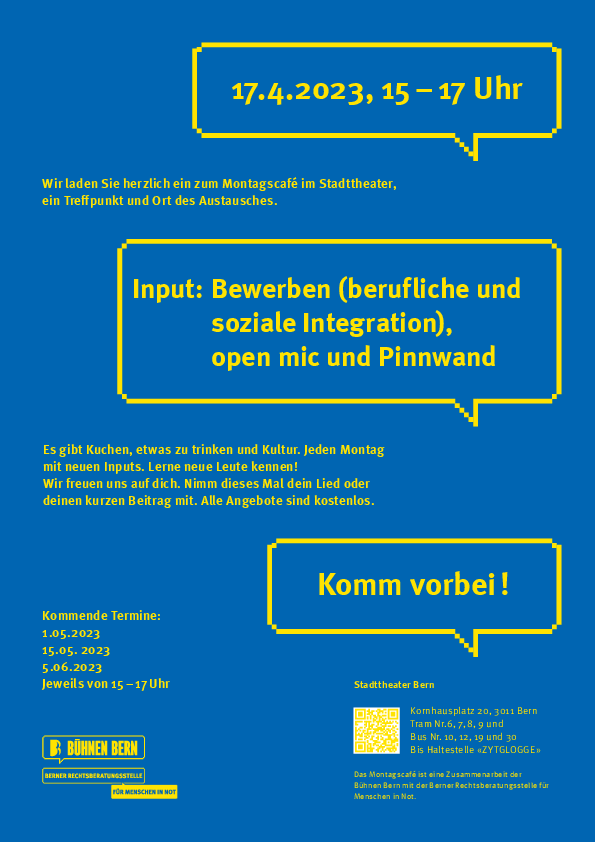 Am Montag 17. April von 15 bis 17 Uhr findet erneut das Montagscafé für Geflüchtete im Foyer des Stadttheater Bern statt. Diesmal haben wir folgendes Programm für Sie zusammengestellt: