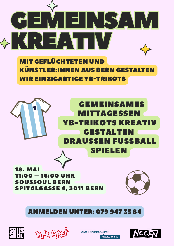 Gemeinsam mit dem Sous Soul will die Berner Rechtsberatungsstelle für Menschen in Not Begegnungen ermöglichen, die universelle kulturelle Teilhabe fördern und den Diskurs zu Flucht und Migration beleben. Wie das aussehen wird? Finden wir es gemeinsam heraus.