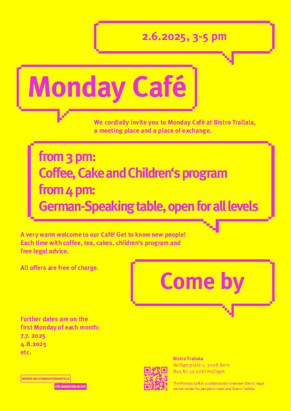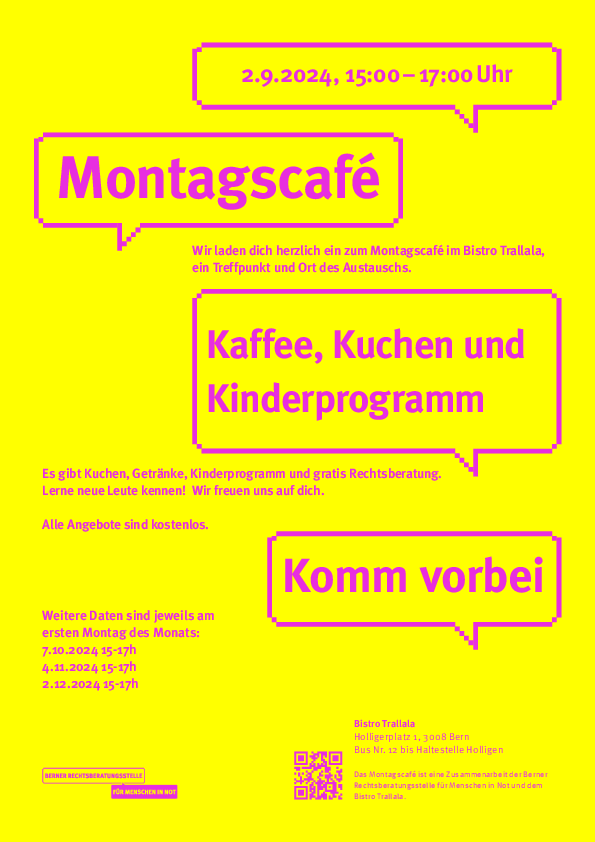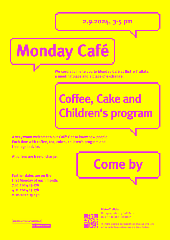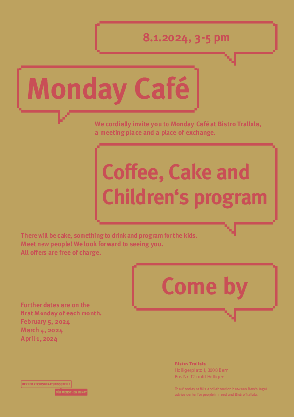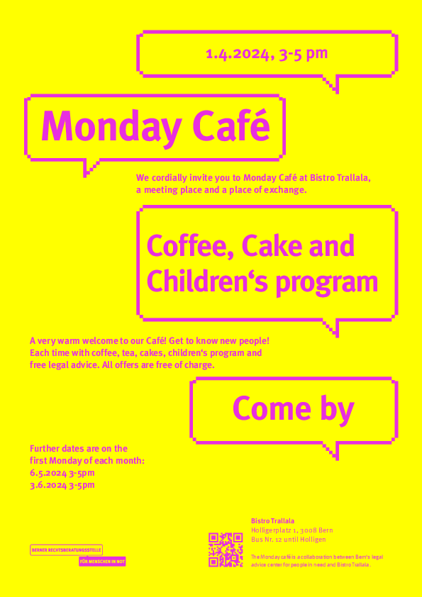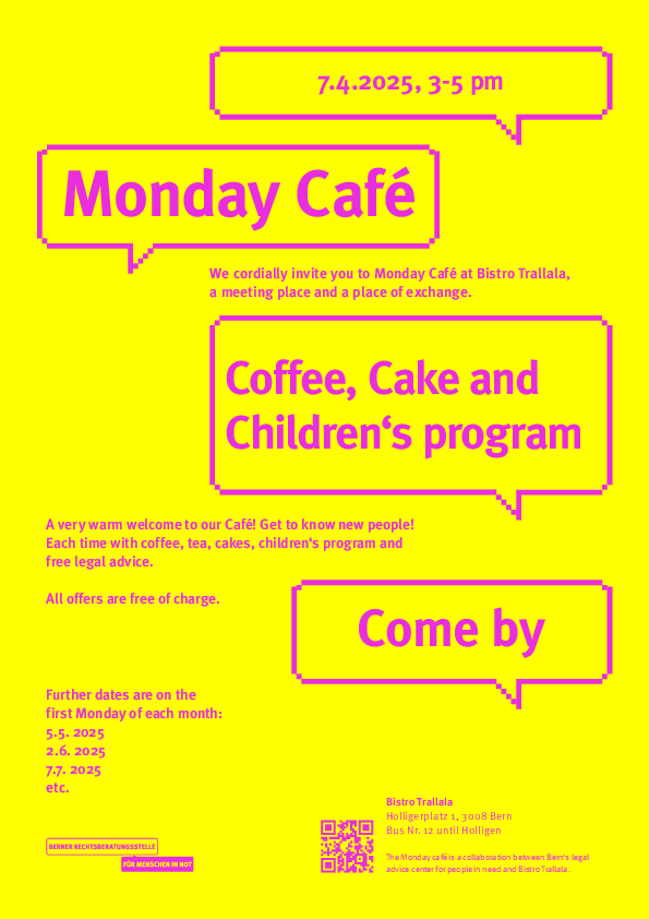 Das Montagscafé ist ein kostenloses Angebot und bietet Raum für grenzenlosen Austausch, Informationen und Kultur bei Kaffee und Kuchen. Gedruckte Flyer können über montagscafe[at]rbsbern.ch bestellt werden.