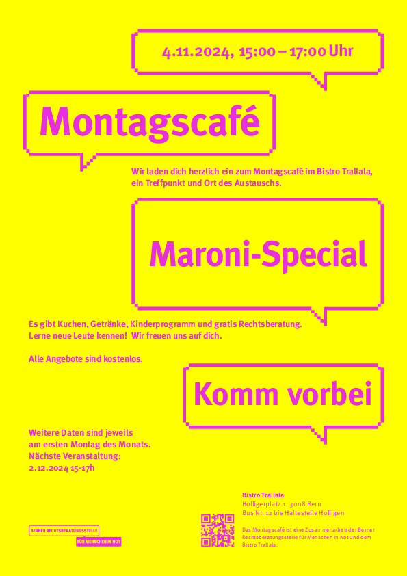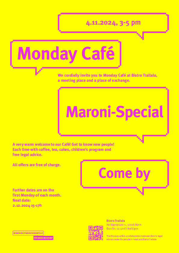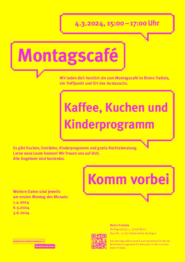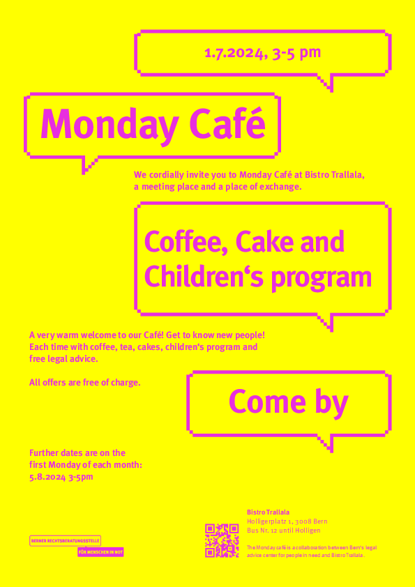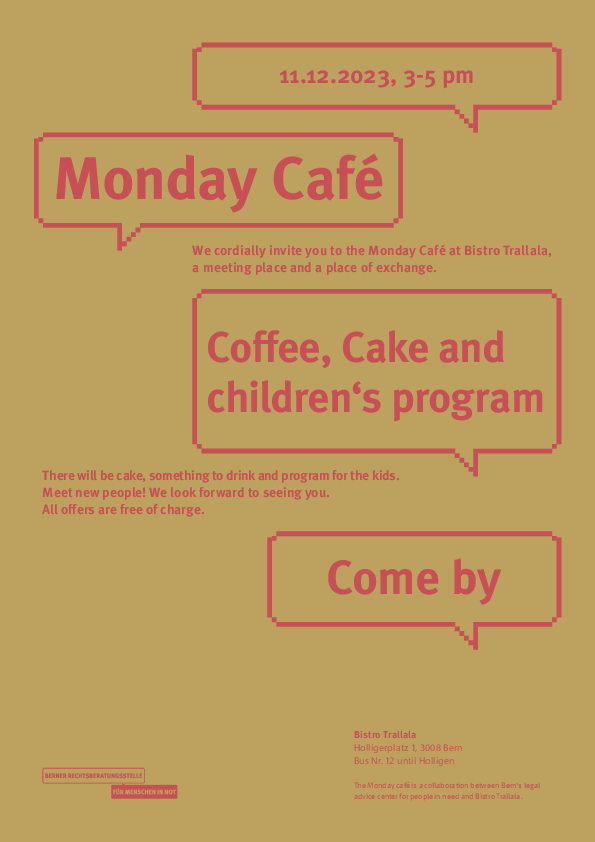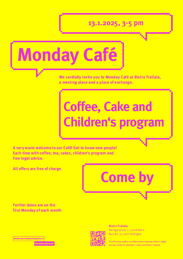 Das Montagscafé ist ein kostenloses Angebot und bietet Raum für grenzenlosen Austausch, Informationen und Kultur bei Kaffee und Kuchen. Gedruckte Flyer können über montagscafe[at]rbsbern.ch bestellt werden.
