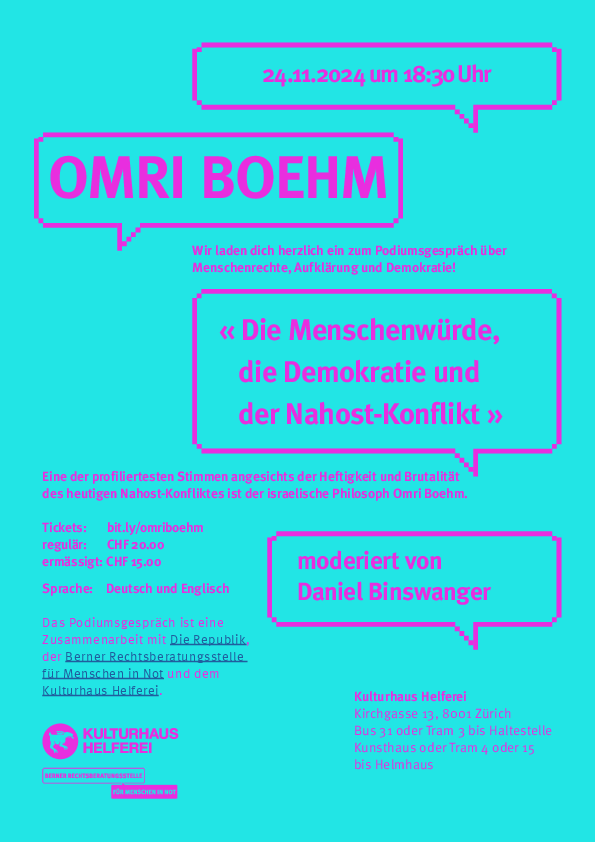 Am Sonntag, 24.11. 2024 ist der Philosoph Omri Böhm zu Gast im Kulturhaus Helferei in Zürich.