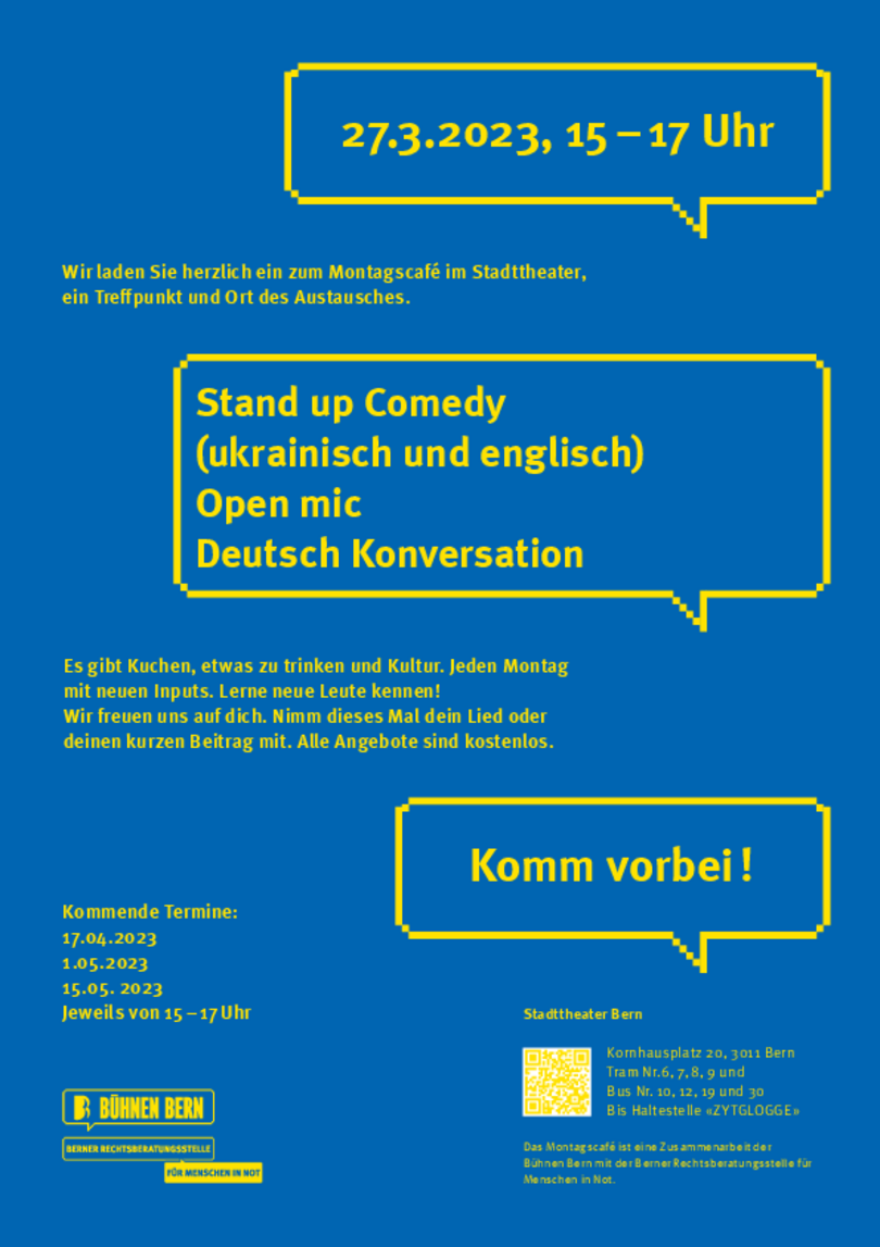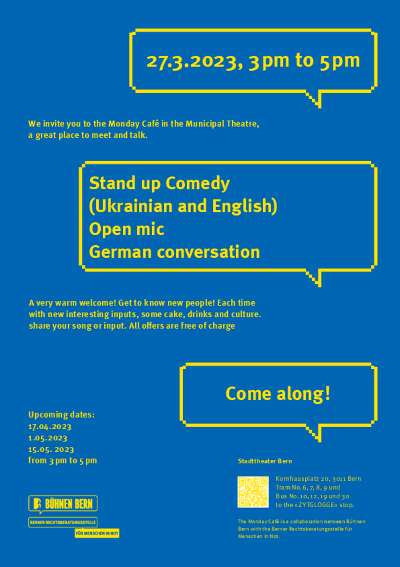 Am Montag 27. März von 15 bis 17 Uhr findet das nächste Montagscafé für Kriegsflüchtlinge im Foyer des Stadttheater Bern statt. Bei dieser Ausgabe steht neben der Show «Stand Up Comedy - Talks for Peace» (ukrainisch & englisch) der Besuch einer Schulklasse auf dem Programm, um sich im Gespräch auszutauschen und Konversation auf Deutsch zu führen. Zudem bieten wir wie immer Rechtsberatung an und öffnen beim Open-Mic die Bühne für Lieder und andere Kurzbeiträge von Besucherinnen und Besuchern.