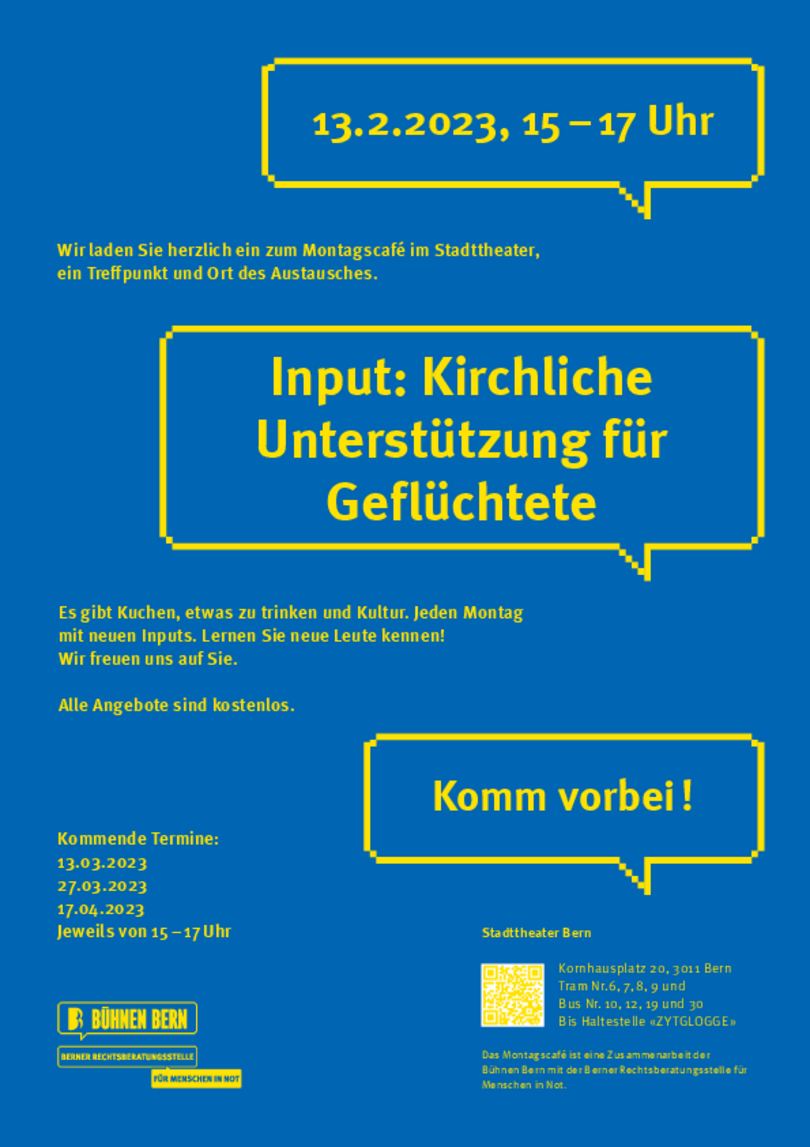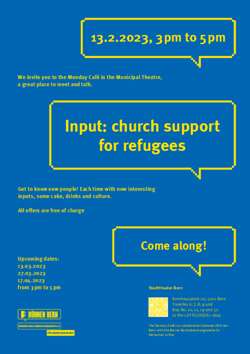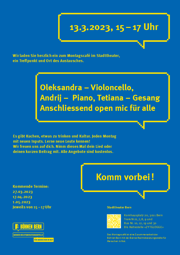 Am Montag, 13. Februar von 15 bis 17 Uhr findet das nächste Montagscafé für Kriegsflüchtlinge im Foyer des Stadttheater Bern statt. Neben Kaffee und Kuchen erwarten Sie zwei Kurzinputs zum Thema «Kirchliche Unterstützung für Geflüchtete». Darin erfahren Sie, was die Reformierte Kirche Bethlehem und die Christkatholische Kirche Bern für Schutzsuchende anbieten. Anschliessend wird erneut Live-Musik gespielt und das Open-Mic für persönliche Beiträge geöffnet.