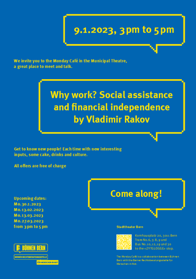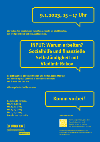Am Montag, 9. Januar von 15 bis 17 Uhr starten wir mit der ersten Ausgabe 2023 des Montagscafé für Kriegsflüchtlinge im Foyer des Stadttheater Bern. Auf dem Programm steht der Input «Warum arbeiten? Sozialhilfe und finanzielle Selbstständigkeit» von Vladimir Rakov. Er hat Business und Recht an der Universität Bern studiert und für die DEZA gearbeitet.