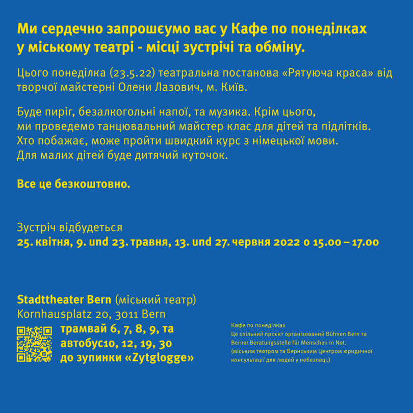 Am Montag, 17. Oktober 2022 von 15 bis 17 Uhr findet das Montagscafé für Kriegsflüchtlinge erneut im Foyer des Stadttheater Bern statt. Diesmal stehen Ausschnitte einer Stand-Up Comedy (in Ukrainisch, Arabisch, Deutsch & Russisch), ein Input zu «Umweltquartier & Reste-Kochkurs» von Zahraa Alassadis sowie Open Mic auf dem Programm.