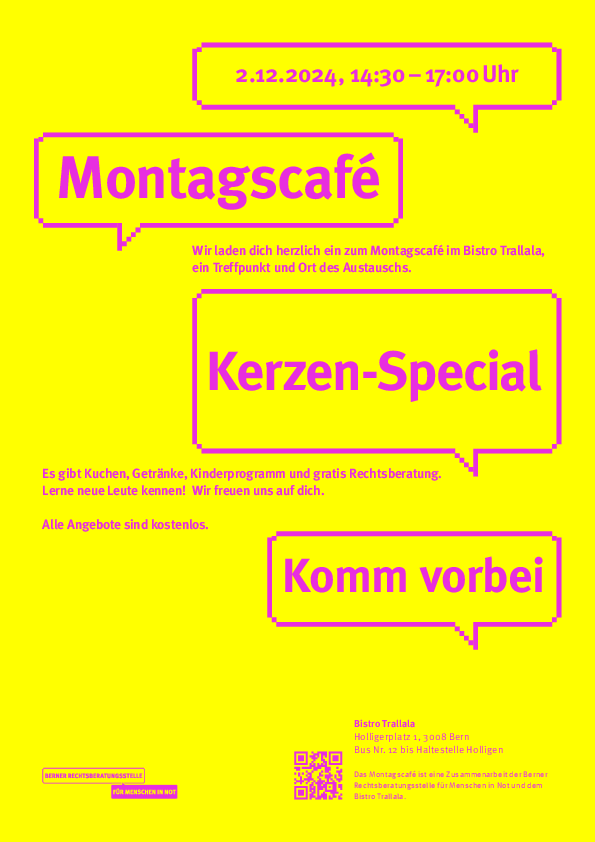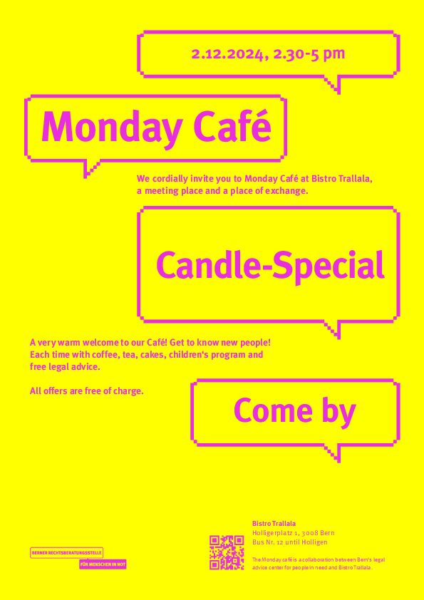Das Montagscafé ist ein kostenloses Angebot und bietet Raum für grenzenlosen Austausch, Informationen und Kultur bei Kaffee und Kuchen. Gedruckte Flyer können gerne über montagscafe[at]rbsbern.ch bestellt werden.