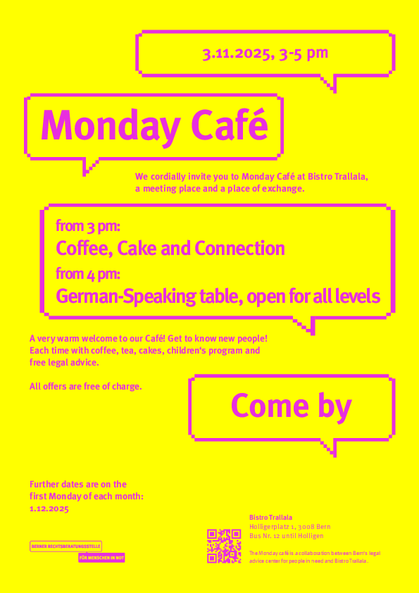 Das Montagscafé ist ein kostenloses Angebot und bietet Raum für grenzenlosen Austausch, Informationen und Kultur bei Kaffee und Kuchen. Gedruckte Flyer können über montagscafe[at]rbsbern.ch bestellt werden.